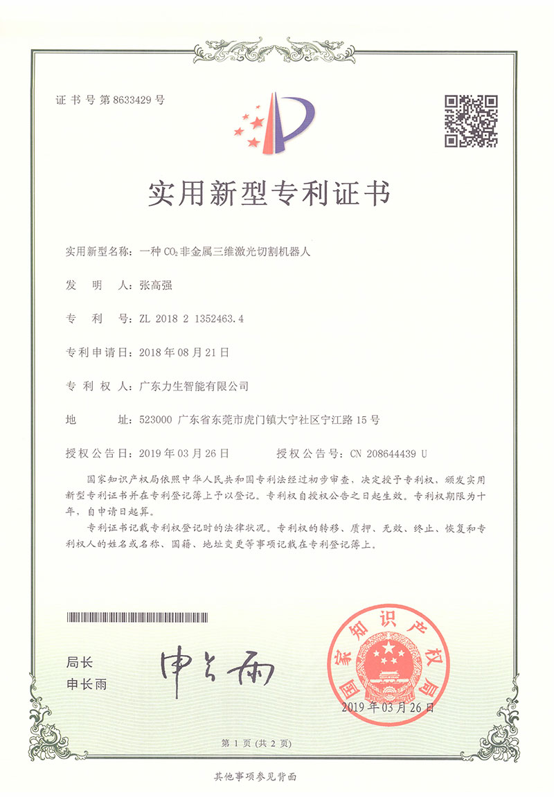 2018Utility model patent certificate CO2 nonmetal 3D laser cutting robot
