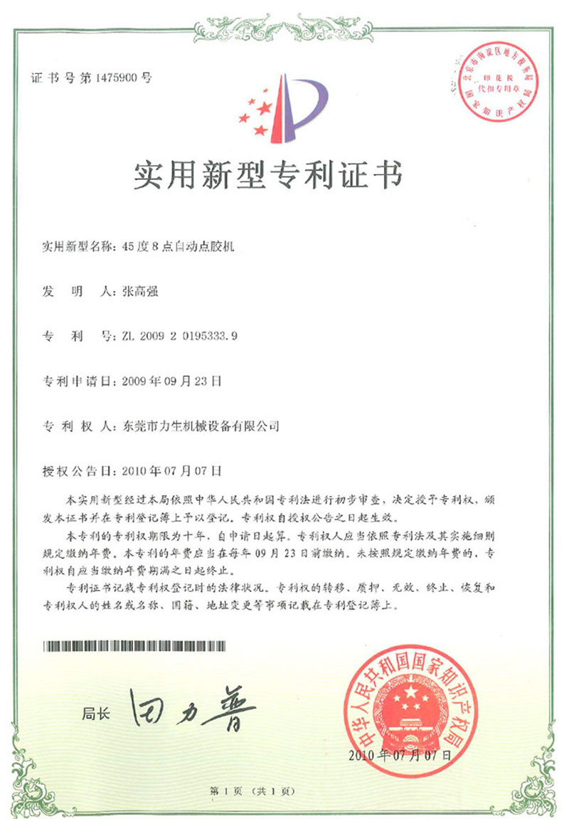 Utility model patent certificate 45 degree 8 point automatic dispensing machine