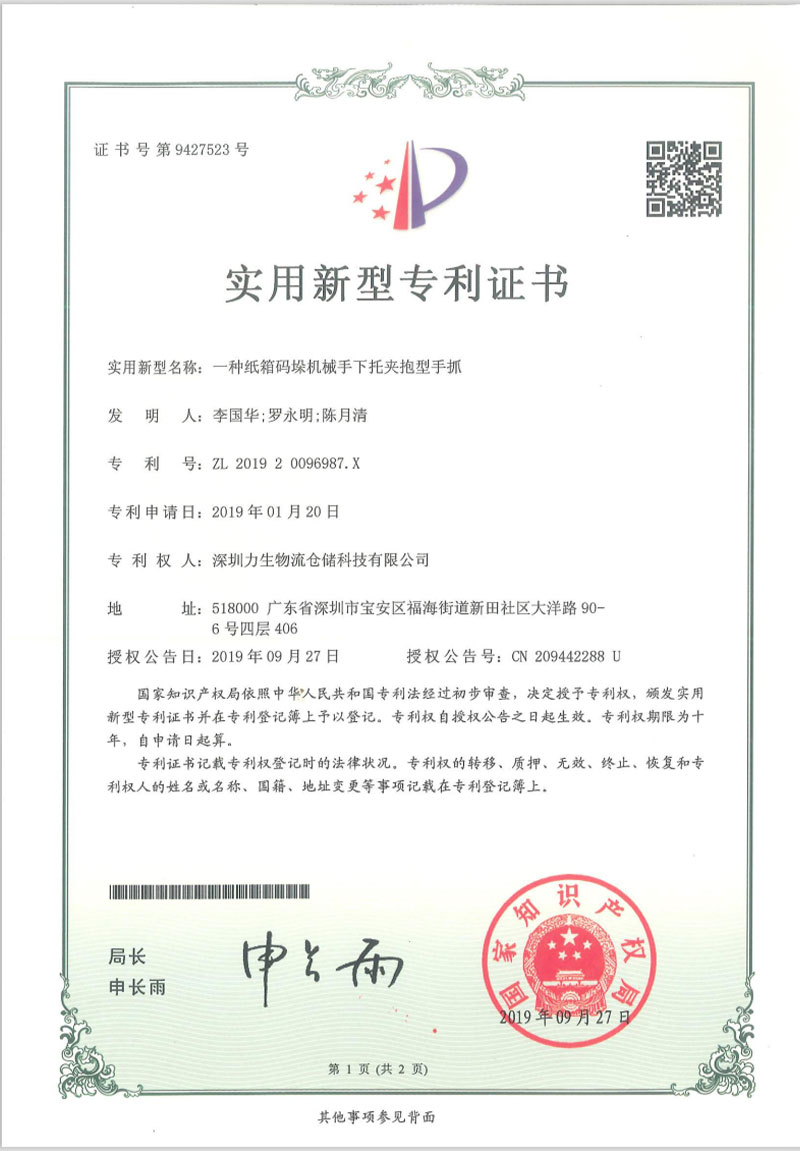 Utility model patent certificate A new type of hand grip for carton palletizing machine