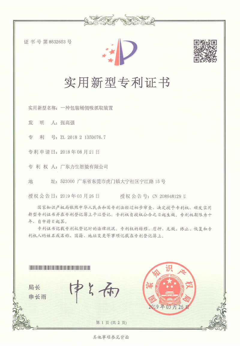 Utility model patent certificate A side suction grab device for packaging barrel